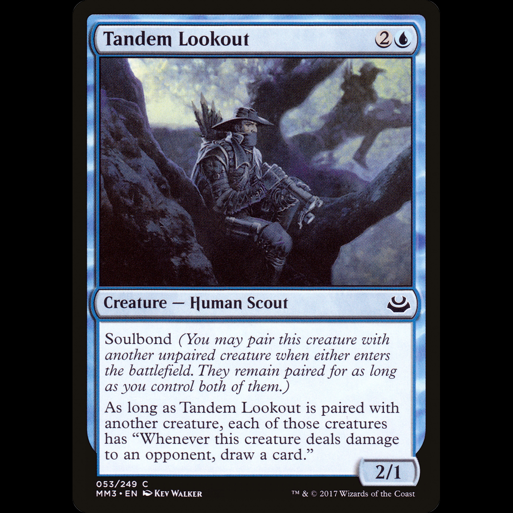 MTG Tandem Lookout Modern Masters 2017 Soulbond (You may pair this creature with another unpaired creature when either enters the battlefield. They remain paired for as long as you control both of them.) As long as Tandem Lookout is paired with another creature, each of those creatures has "Whenever this creature deals damage to an opponent, draw a card."