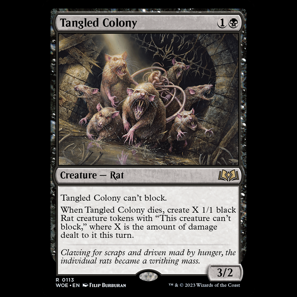 When Tangled Colony dies, create X 1/1 black Rat creature tokens with "This creature can't block," where X is the amount of damage dealt to it this turn.