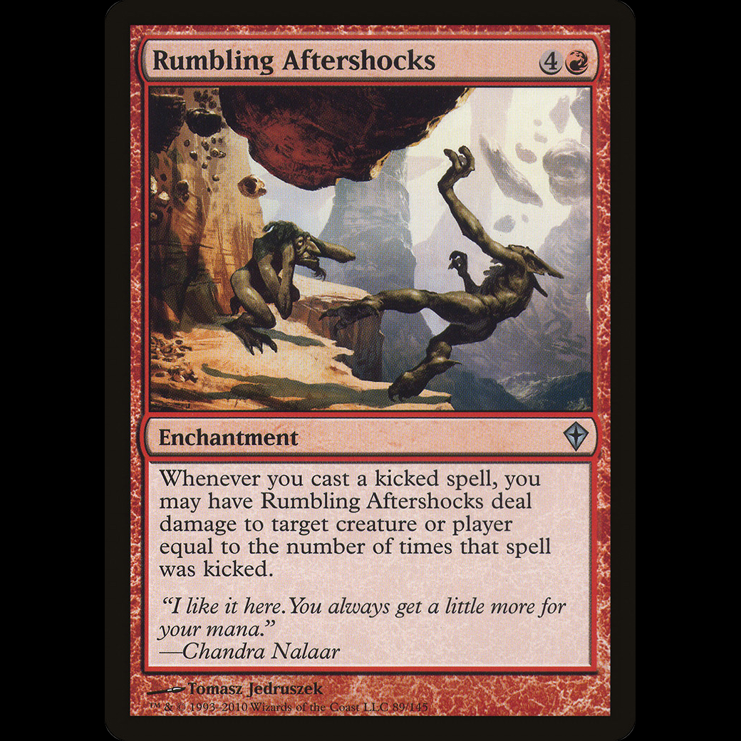Whenever you cast a kicked spell, you may have Rumbling Aftershocks deal damage to any target equal to the number of times that spell was kicked.