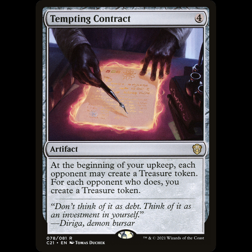 At the beginning of your upkeep, each opponent may create a Treasure token. For each opponent who does, you create a Treasure token.