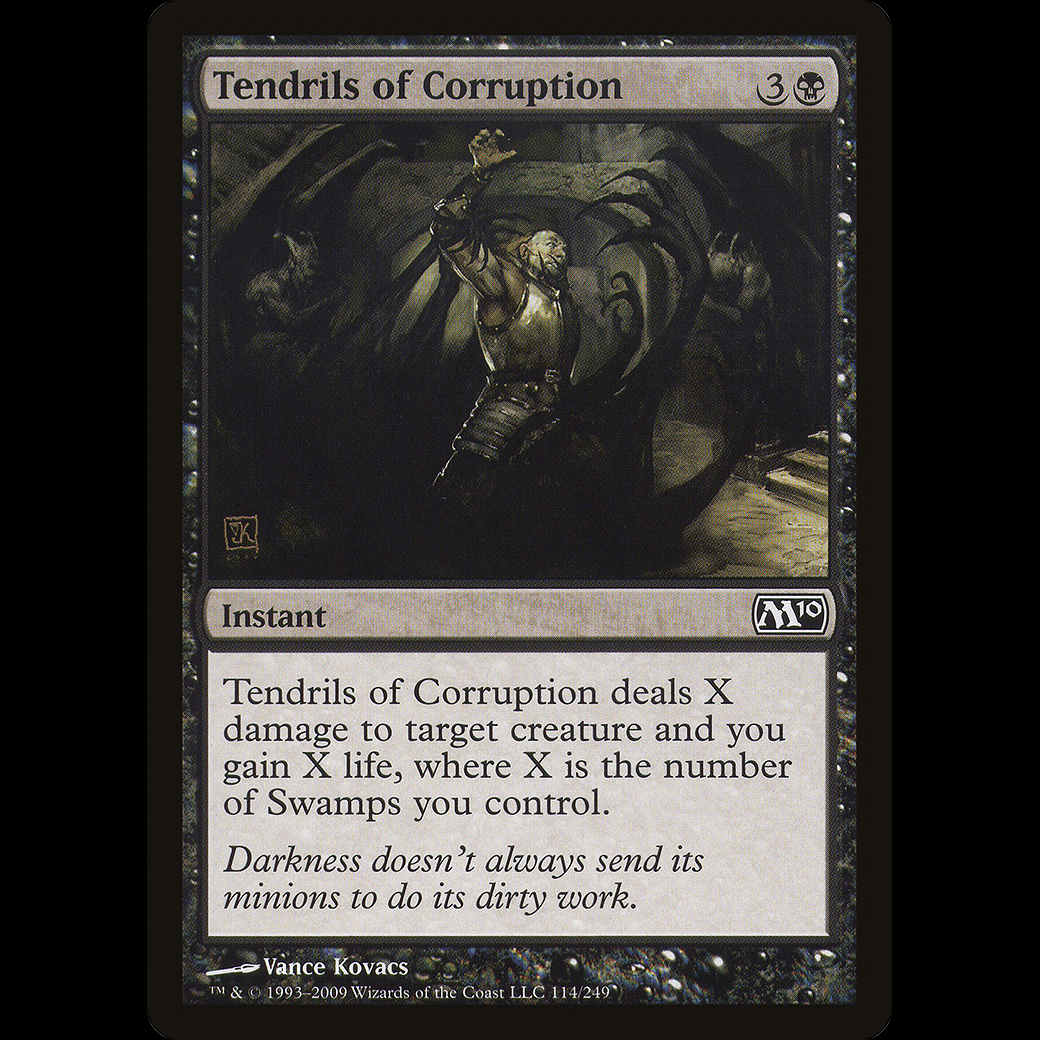 Tendrils of Corruption deals X damage to target creature and you gain X life, where X is the number of Swamps you control.