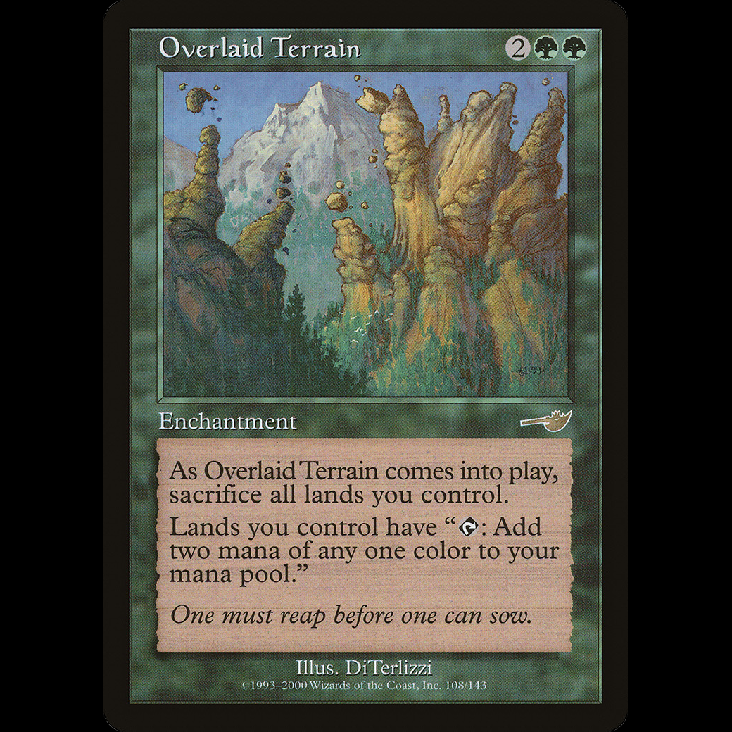 As Overlaid Terrain enters the battlefield, sacrifice all lands you control.