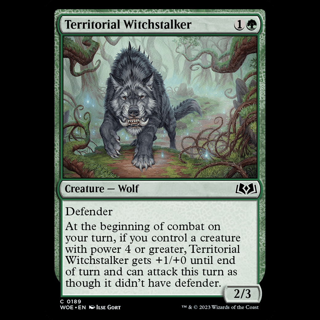 At the beginning of combat on your turn, if you control a creature with power 4 or greater, Territorial Witchstalker gets +1/+0 until end of turn and can attack this turn as though it didn't have defender.