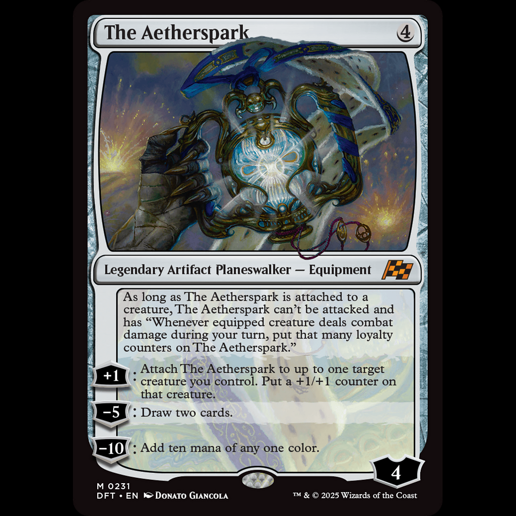 As long as The Aetherspark is attached to a creature, The Aetherspark can't be attacked and has "Whenever equipped creature deals combat damage during your turn, put that many loyalty counters on The Aetherspark."