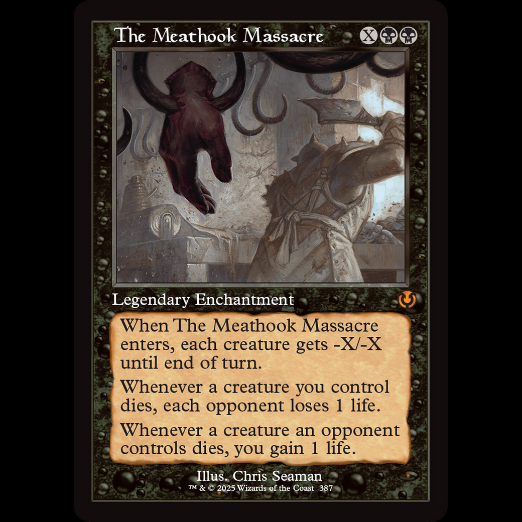 When The Meathook Massacre enters, each creature gets -X/-X until end of turn.