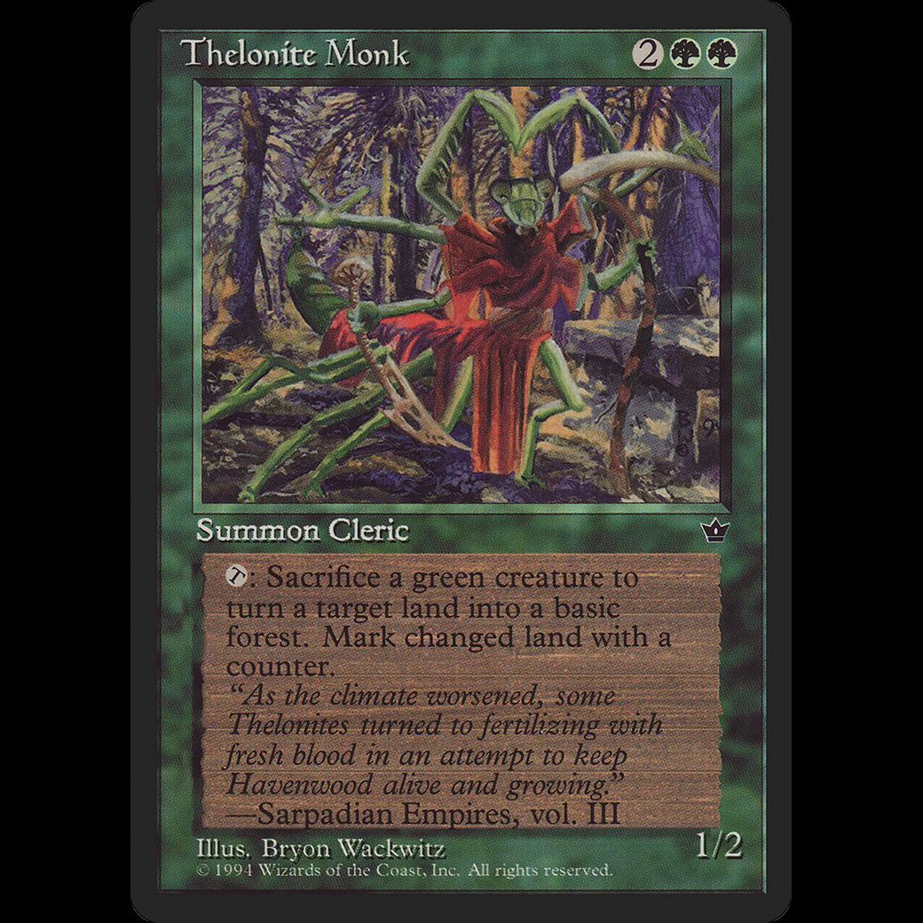 , Sacrifice a green creature: Target land becomes a Forest. (This effect lasts indefinitely.)