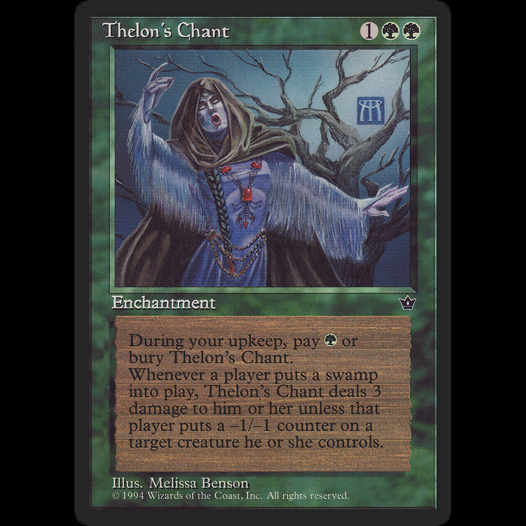 MTG Thelon's Chant Fallen Empires - PL At the beginning of your upkeep, sacrifice Thelon's Chant unless you pay . Whenever a player puts a Swamp onto the battlefield, Thelon's Chant deals 3 damage to that player unless the player puts a -1/-1 counter on a creature they control.