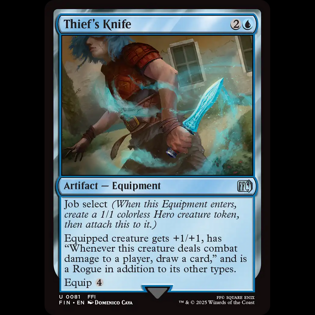 Equipped creature gets +1/+1, has "Whenever this creature deals combat damage to a player, draw a card," and is a Rogue in addition to its other types.