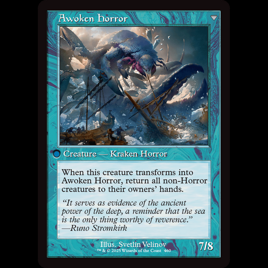 When this creature transforms into Awoken Horror, return all non-Horror creatures to their owners' hands.