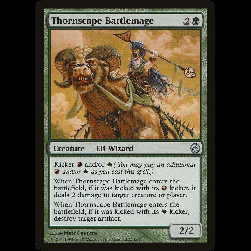 When Thornscape Battlemage enters the battlefield, if it was kicked with its kicker, destroy target artifact.