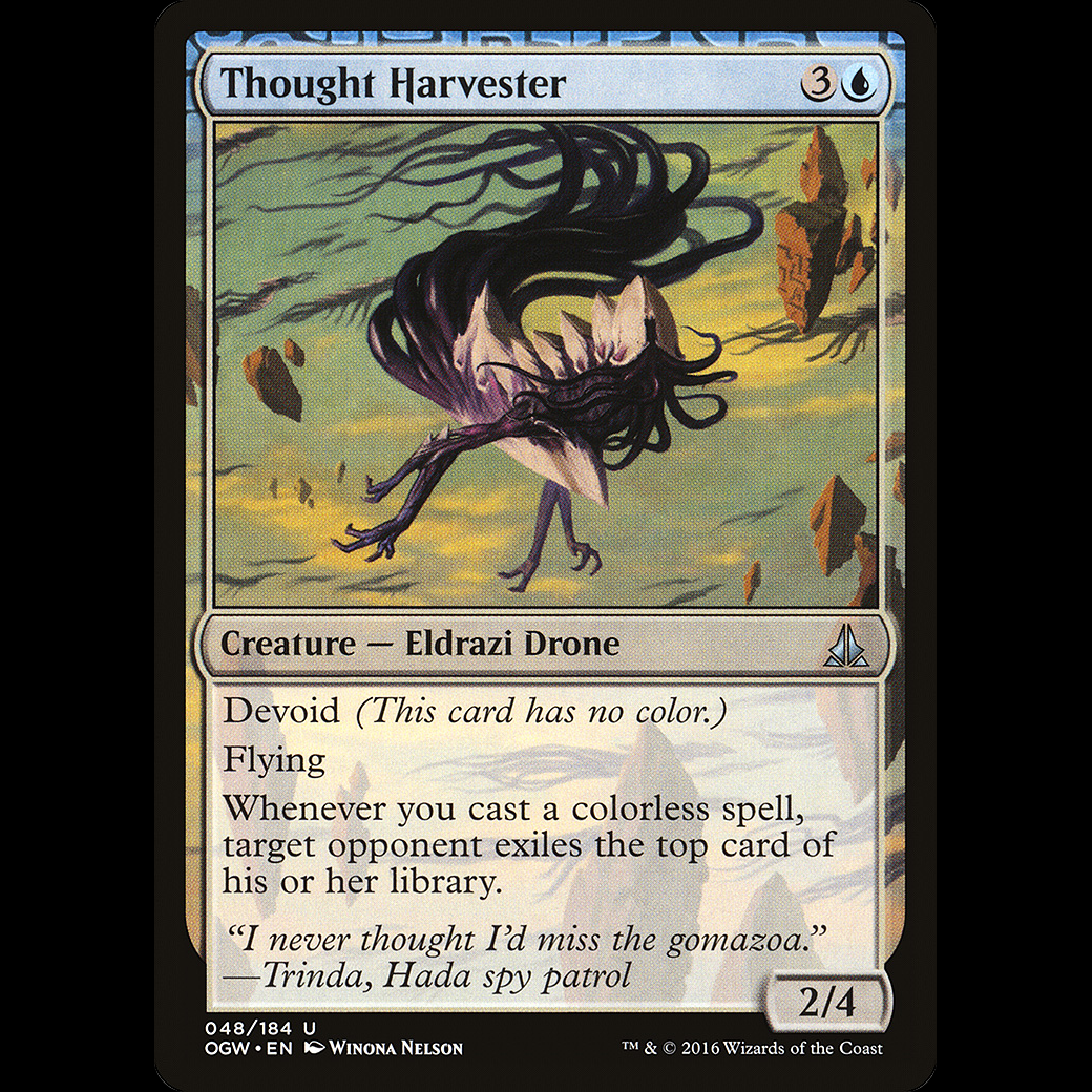 Whenever you cast a colorless spell, target opponent exiles the top card of their library.