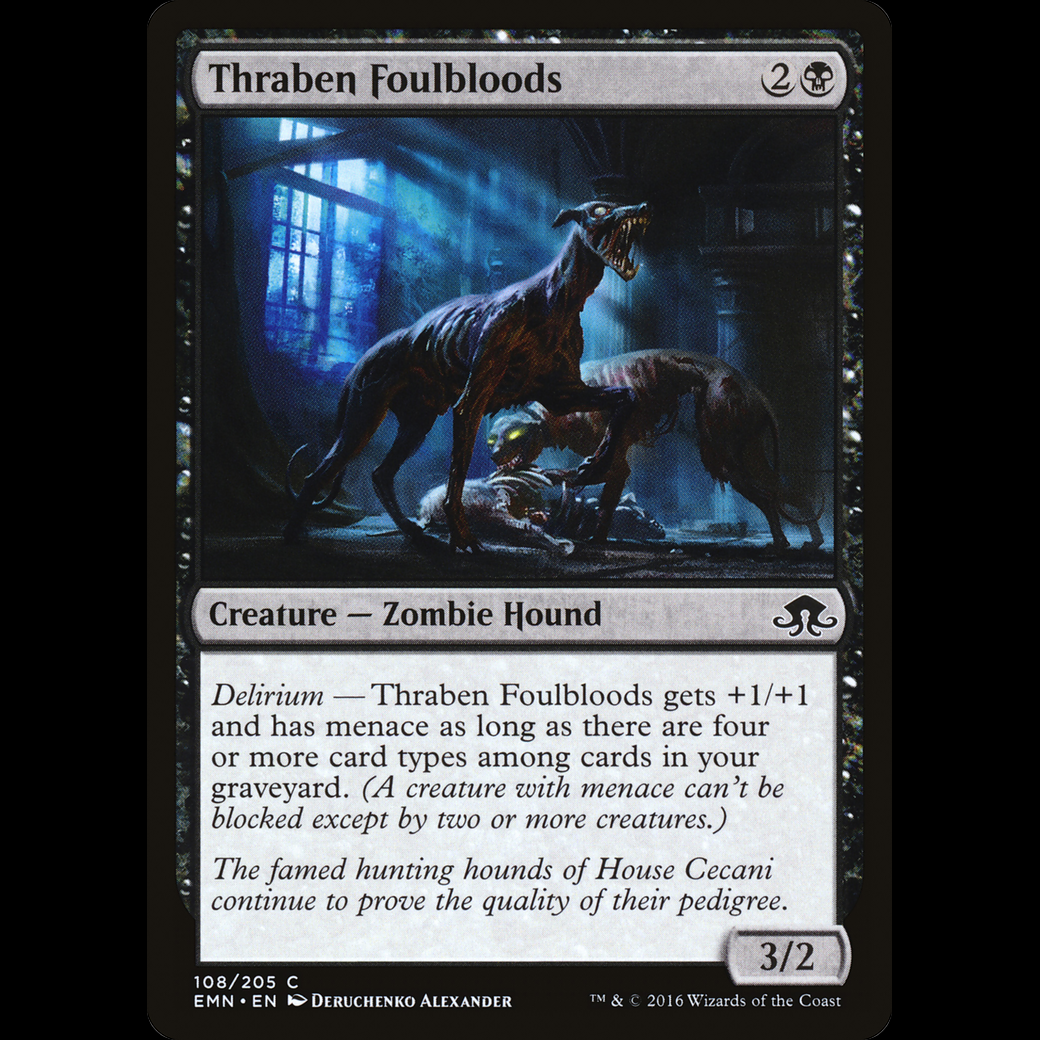 Delirium — Thraben Foulbloods gets +1/+1 and has menace as long as there are four or more card types among cards in your graveyard. (A creature with menace can't be blocked except by two or more creatures.)
