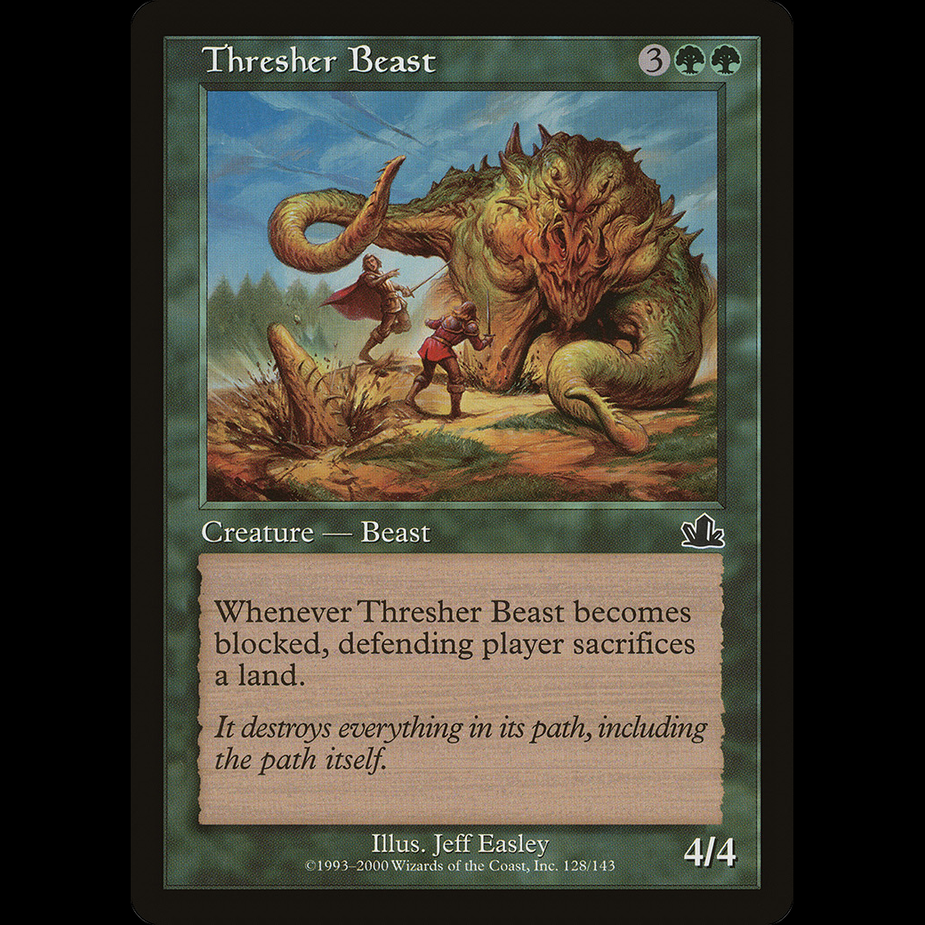Whenever Thresher Beast becomes blocked, defending player sacrifices a land.