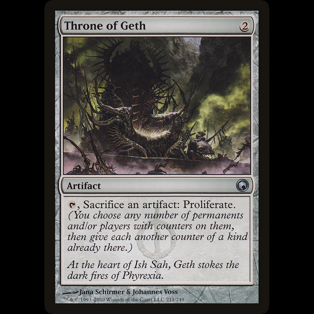 {T}, Sacrifice an artifact: Proliferate. (Choose any number of permanents and/or players, then give each another counter of each kind already there.)