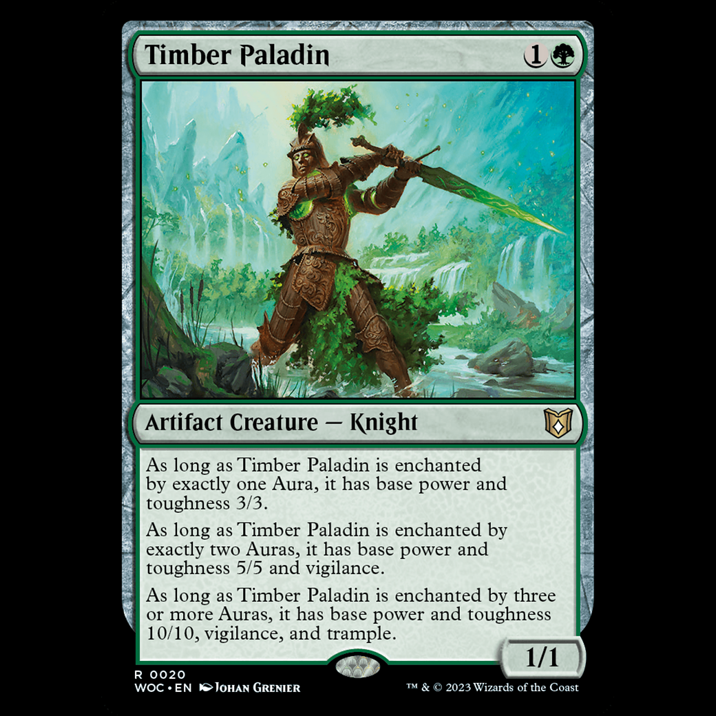 As long as Timber Paladin is enchanted by exactly one Aura, it has base power and toughness 3/3.