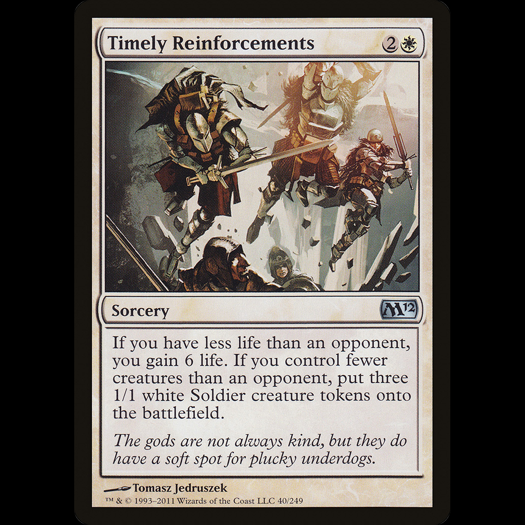 If you have less life than an opponent, you gain 6 life. If you control fewer creatures than an opponent, create three 1/1 white Soldier creature tokens.