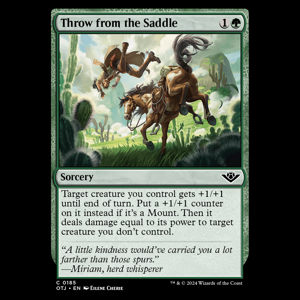 MTG Tirar de la silla (Throw from the Saddle) Outlaws of Thunder Junction otj#185 Target creature you control gets +1/+1 until end of turn. Put a +1/+1 counter on it instead if it's a Mount. Then it deals damage equal to its power to target creature you don't control.