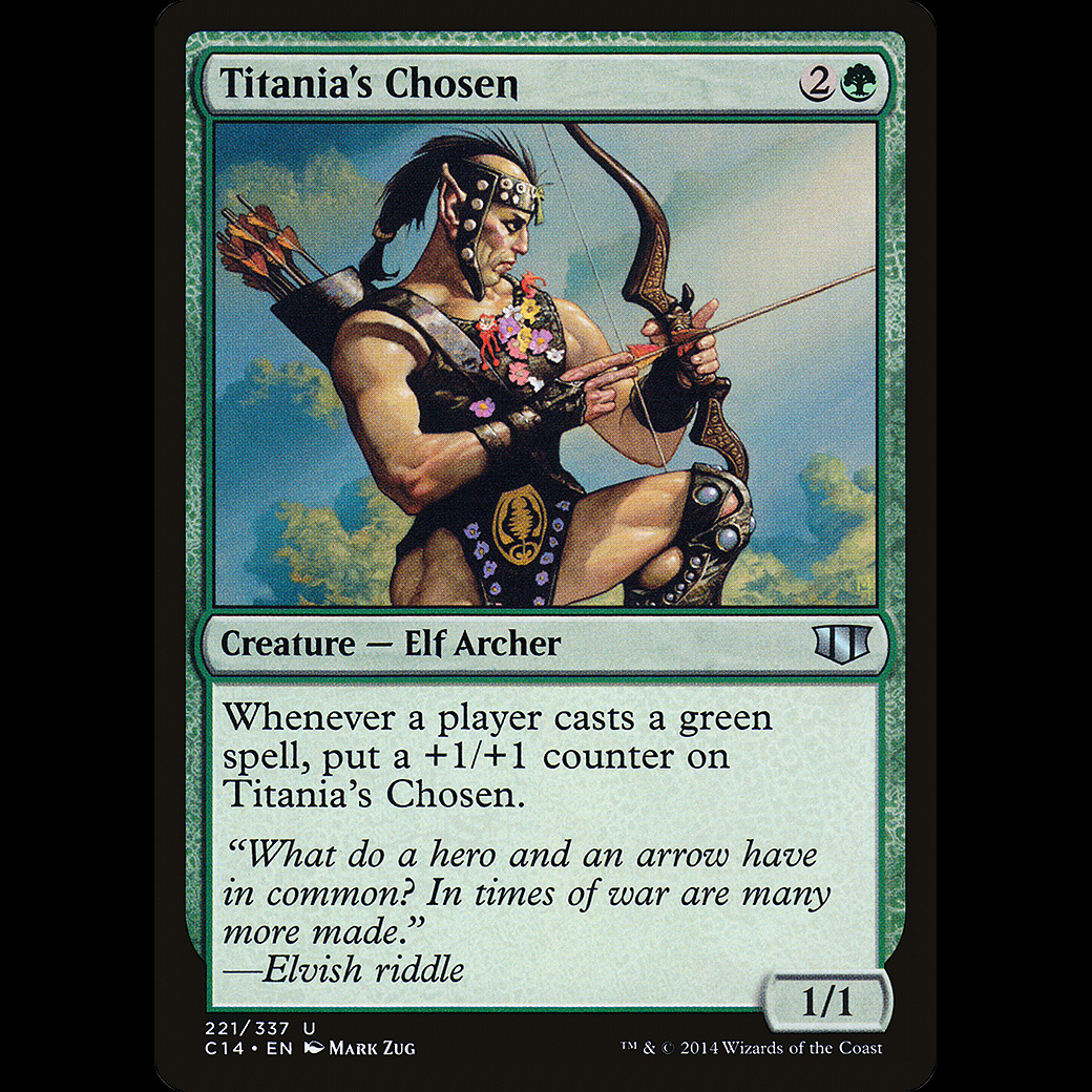 Whenever a player casts a green spell, put a +1/+1 counter on Titania's Chosen.