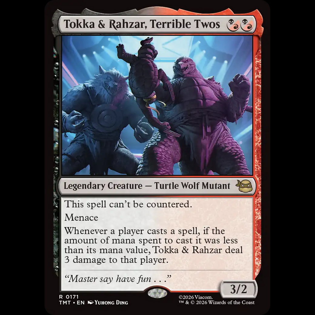 Whenever a player casts a spell, if the amount of mana spent to cast it was less than its mana value, Tokka & Rahzar deal 3 damage to that player.