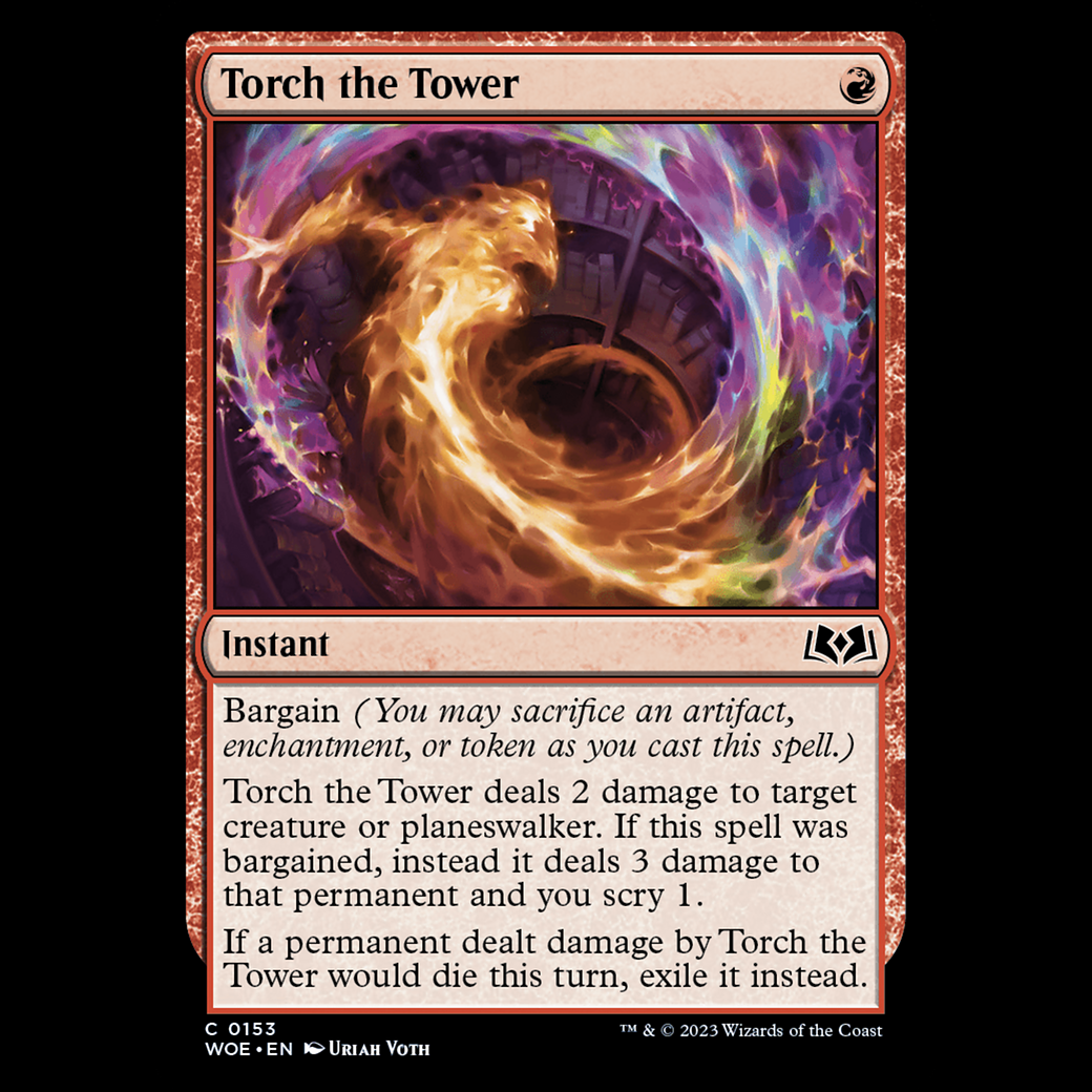 Torch the Tower deals 2 damage to target creature or planeswalker. If this spell was bargained, instead it deals 3 damage to that permanent and you scry 1.