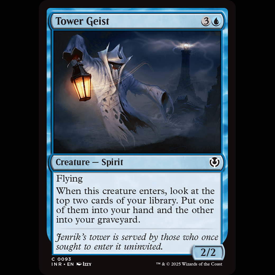 When Tower Geist enters, look at the top two cards of your library. Put one of them into your hand and the other into your graveyard.
