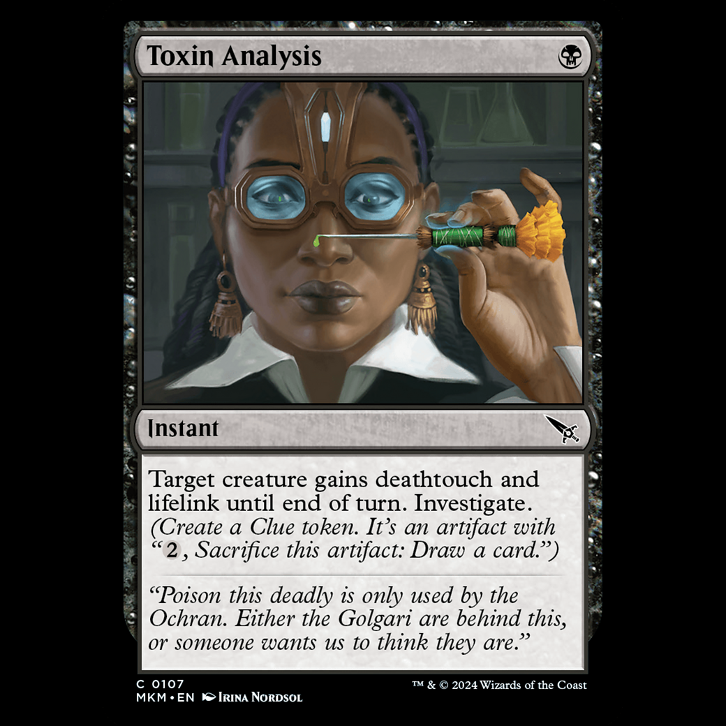Target creature gains deathtouch and lifelink until end of turn. Investigate. (Create a Clue token. It's an artifact with ", Sacrifice this artifact: Draw a card.")