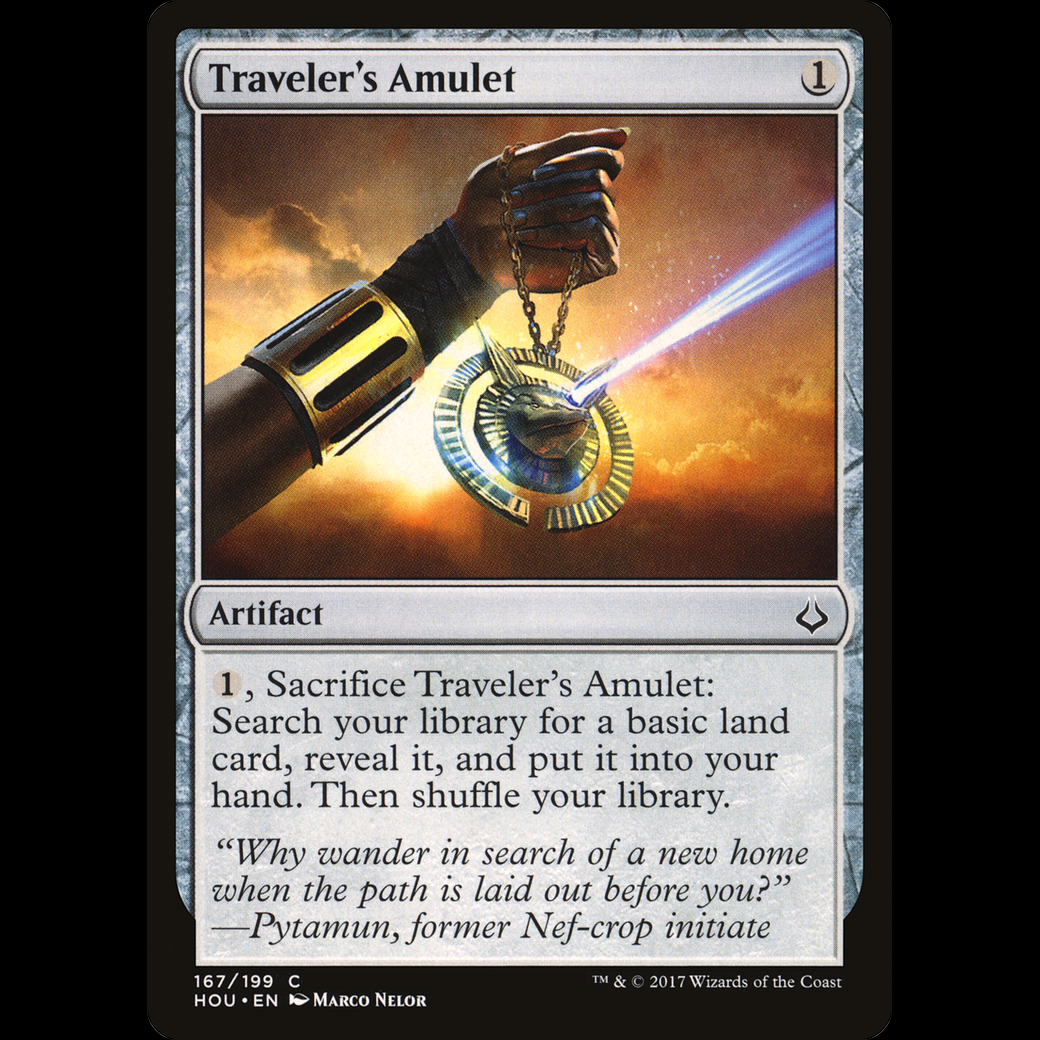 , Sacrifice Traveler's Amulet: Search your library for a basic land card, reveal it, put it into your hand, then shuffle.