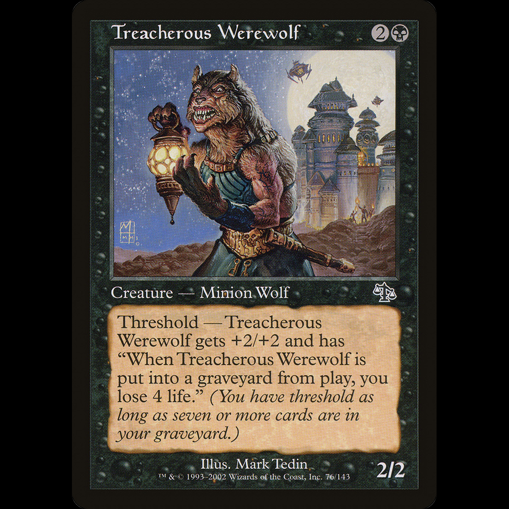 Threshold — As long as seven or more cards are in your graveyard, Treacherous Werewolf gets +2/+2 and has