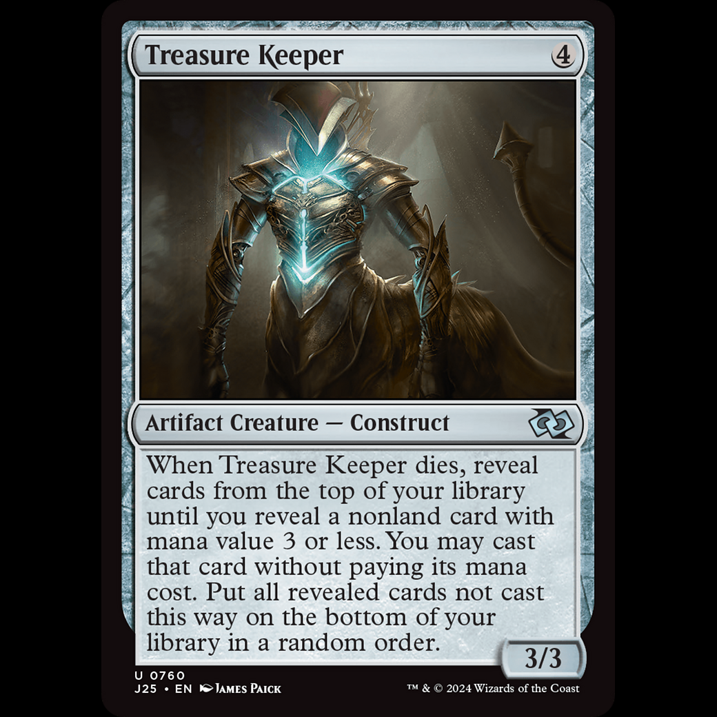 When Treasure Keeper dies, reveal cards from the top of your library until you reveal a nonland card with mana value 3 or less. You may cast that card without paying its mana cost. Put all revealed cards not cast this way on the bottom of your library in a random order.