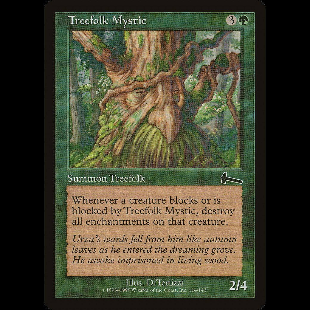Whenever Treefolk Mystic blocks or becomes blocked by a creature, destroy all Auras attached to that creature.