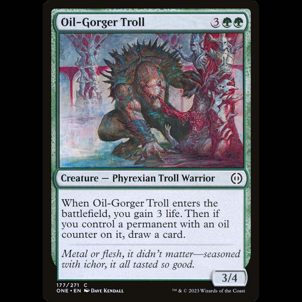 When Oil-Gorger Troll enters, you gain 3 life. Then if you control a permanent with an oil counter on it, draw a card.