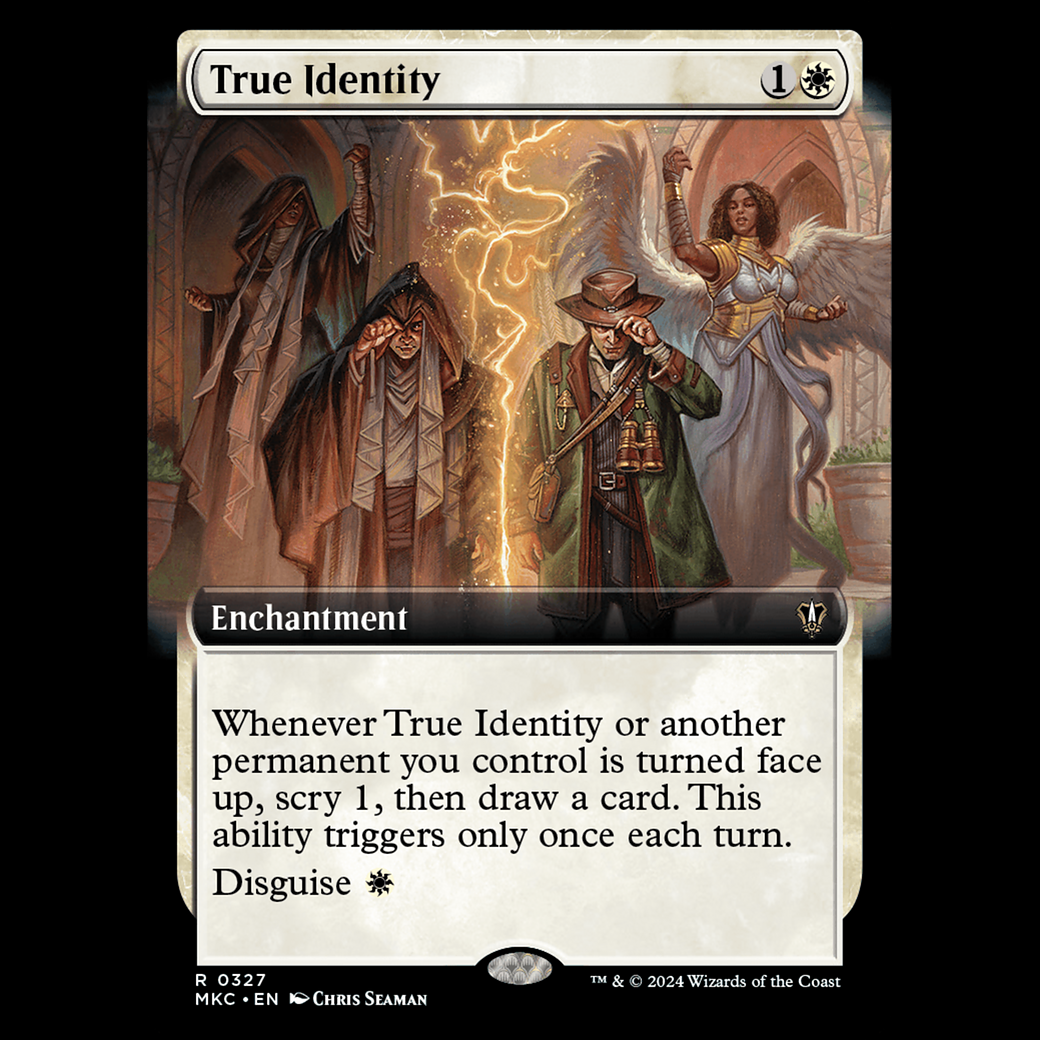 Whenever True Identity or another permanent you control is turned face up, scry 1, then draw a card. This ability triggers only once each turn.