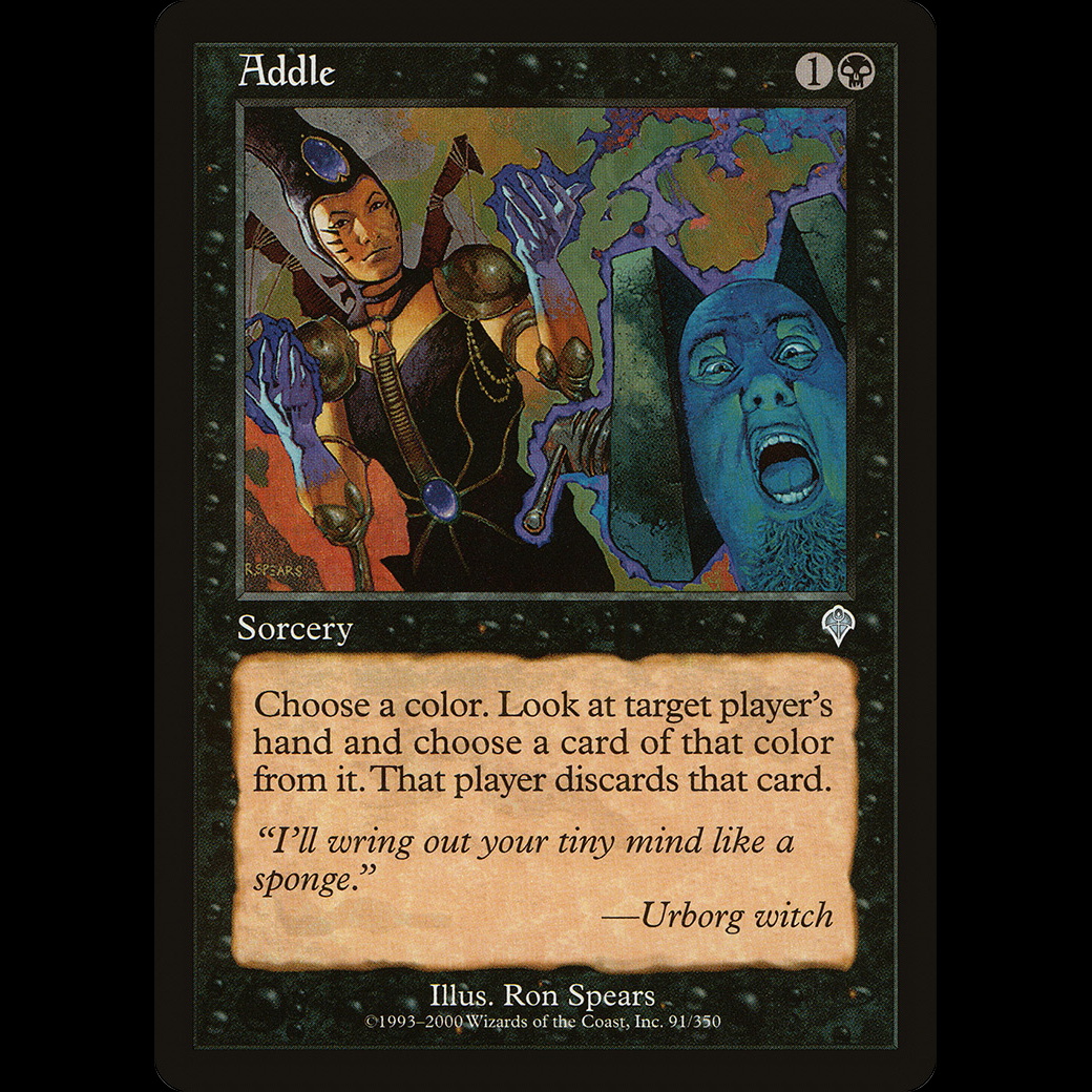 MTG Turbar (Addle) Invasion inv#91Choose a color. Target player reveals their hand and you choose a card of that color from it. That player discards that card.