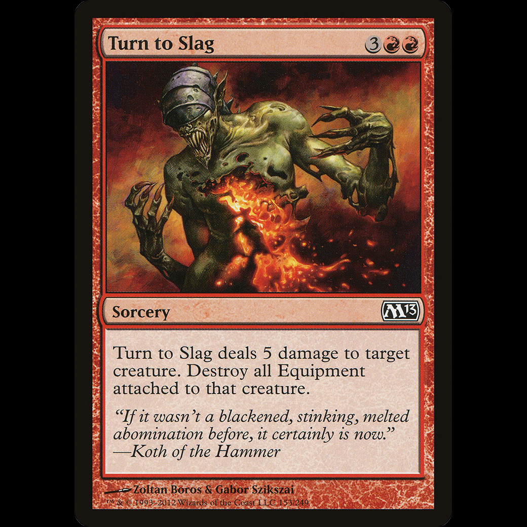 Turn to Slag deals 5 damage to target creature. Destroy all Equipment attached to that creature.