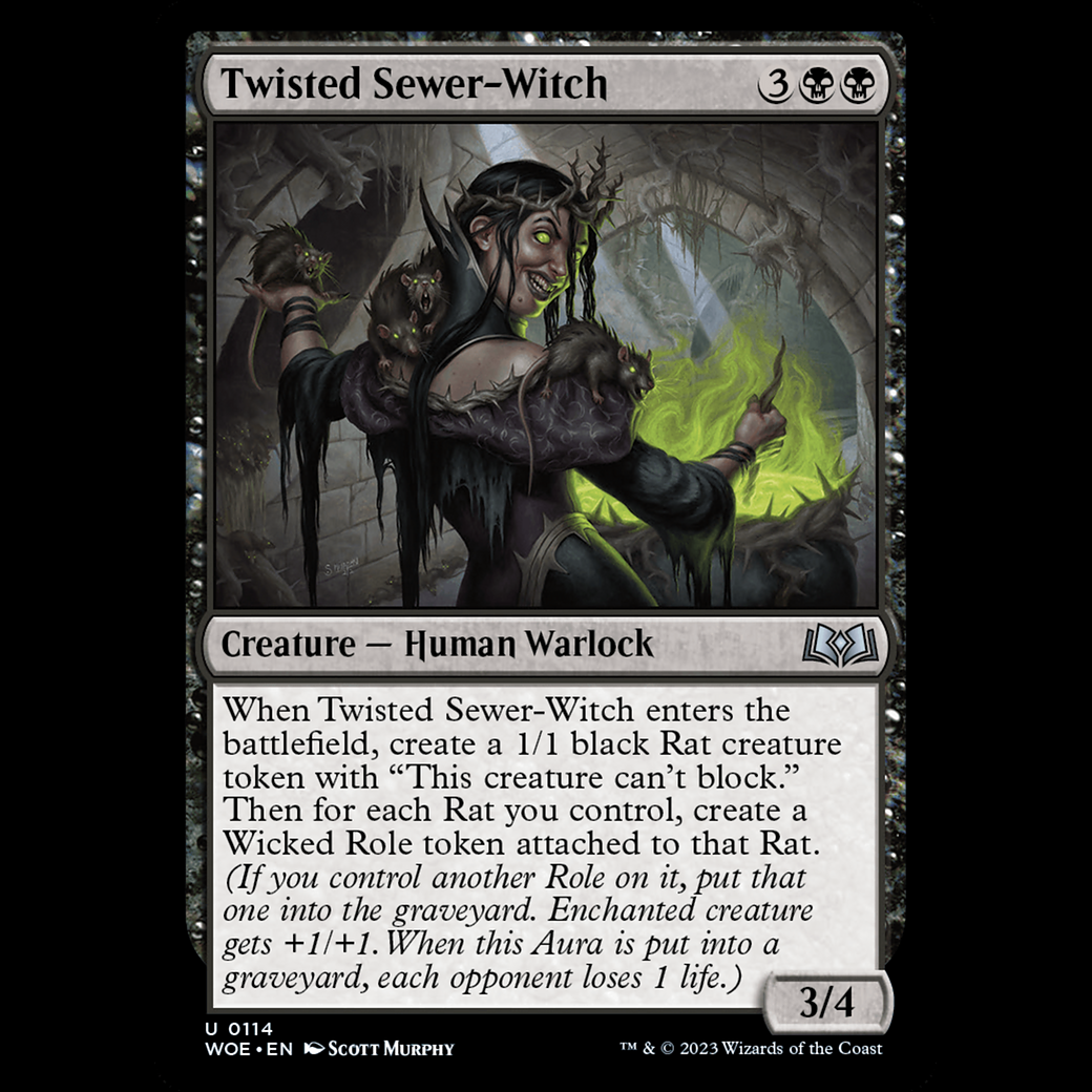 When Twisted Sewer-Witch enters the battlefield, create a 1/1 black Rat creature token with "This creature can't block." Then for each Rat you control, create a Wicked Role token attached to that Rat. (If you control another Role on it, put that one into the graveyard. Enchanted creature gets +1/+1. When this Aura is put into a graveyard, each opponent loses 1 life.)