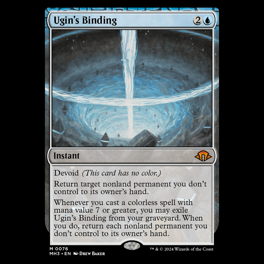 Whenever you cast a colorless spell with mana value 7 or greater, you may exile Ugin's Binding from your graveyard. When you do, return each nonland permanent you don't control to its owner's hand.