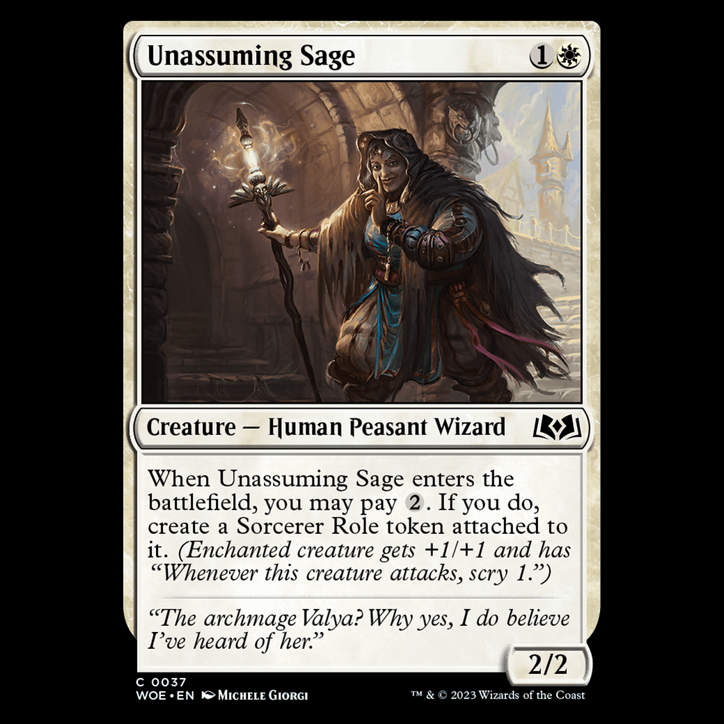 When Unassuming Sage enters the battlefield, you may pay . If you do, create a Sorcerer Role token attached to it. (Enchanted creature gets +1/+1 and has "Whenever this creature attacks, scry 1.")