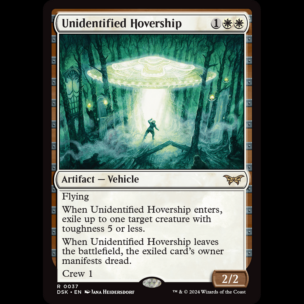When Unidentified Hovership leaves the battlefield, the exiled card's owner manifests dread.