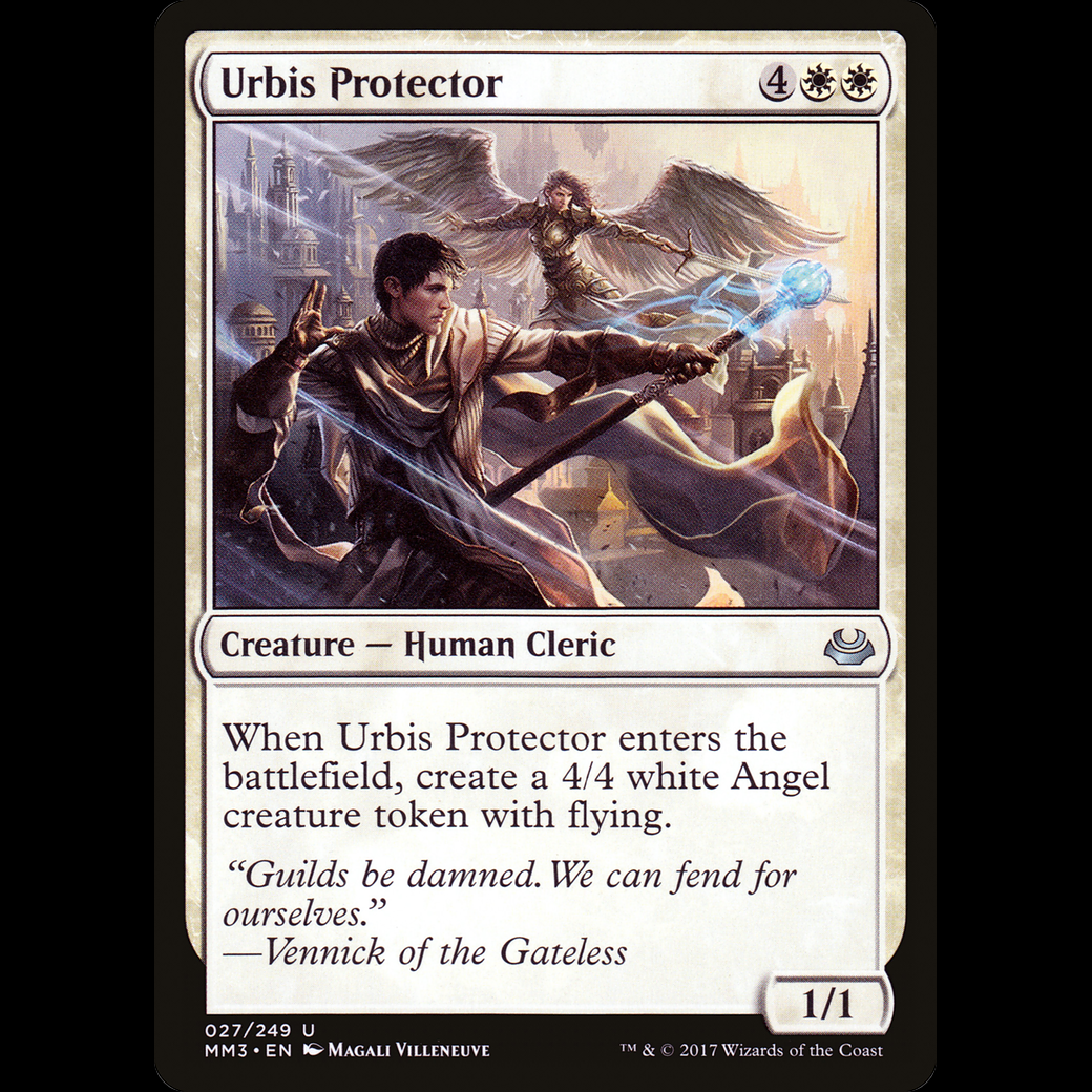 When Urbis Protector enters the battlefield, create a 4/4 white Angel creature token with flying.