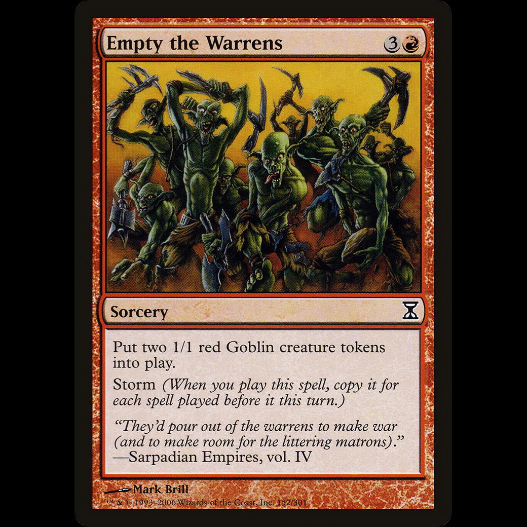 MTG Vaciar los barracones (Empty the Warrens) Time SpiralCreate two 1/1 red Goblin creature tokens. Storm (When you cast this spell, copy it for each spell cast before it this turn.)