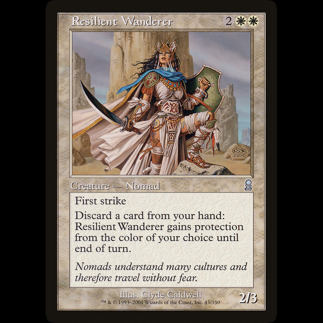 Discard a card: Resilient Wanderer gains protection from the color of your choice until end of turn.