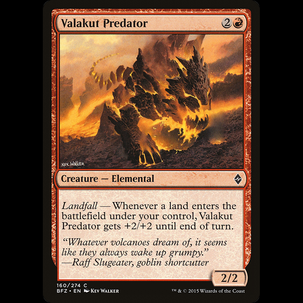 Landfall — Whenever a land enters the battlefield under your control, Valakut Predator gets +2/+2 until end of turn.