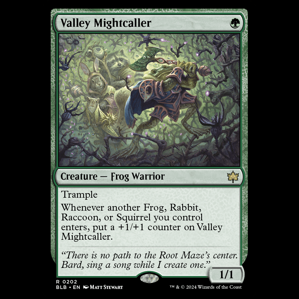 Whenever another Frog, Rabbit, Raccoon, or Squirrel you control enters, put a +1/+1 counter on Valley Mightcaller.