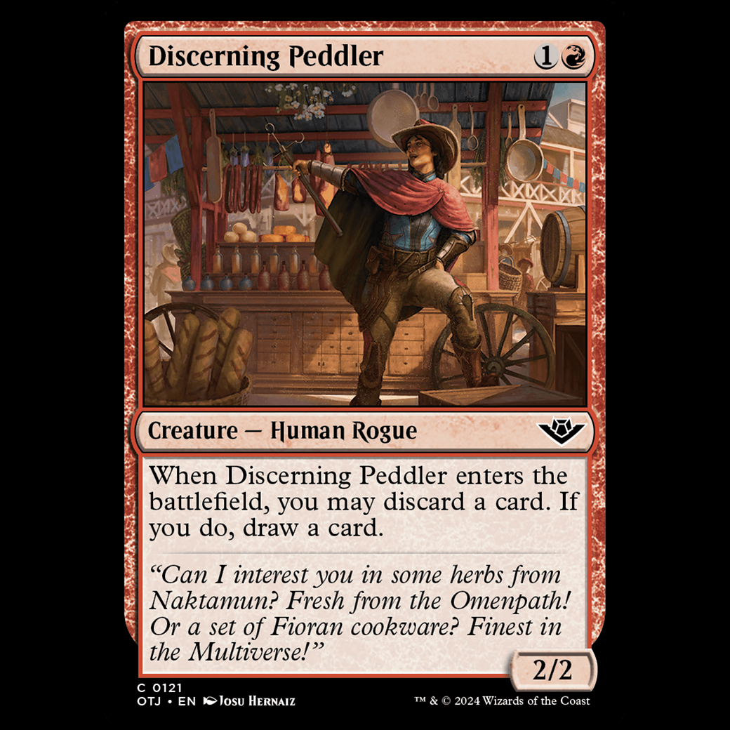 Agregar a favoritosMTG Vendedora perspicaz (Discerning Peddler) Outlaws of Thunder Junction otj#121 When Discerning Peddler enters, you may discard a card. If you do, draw a card.