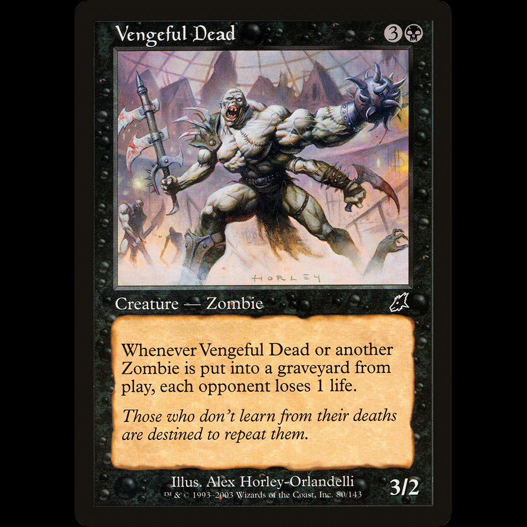 Whenever Vengeful Dead or another Zombie dies, each opponent loses 1 life.