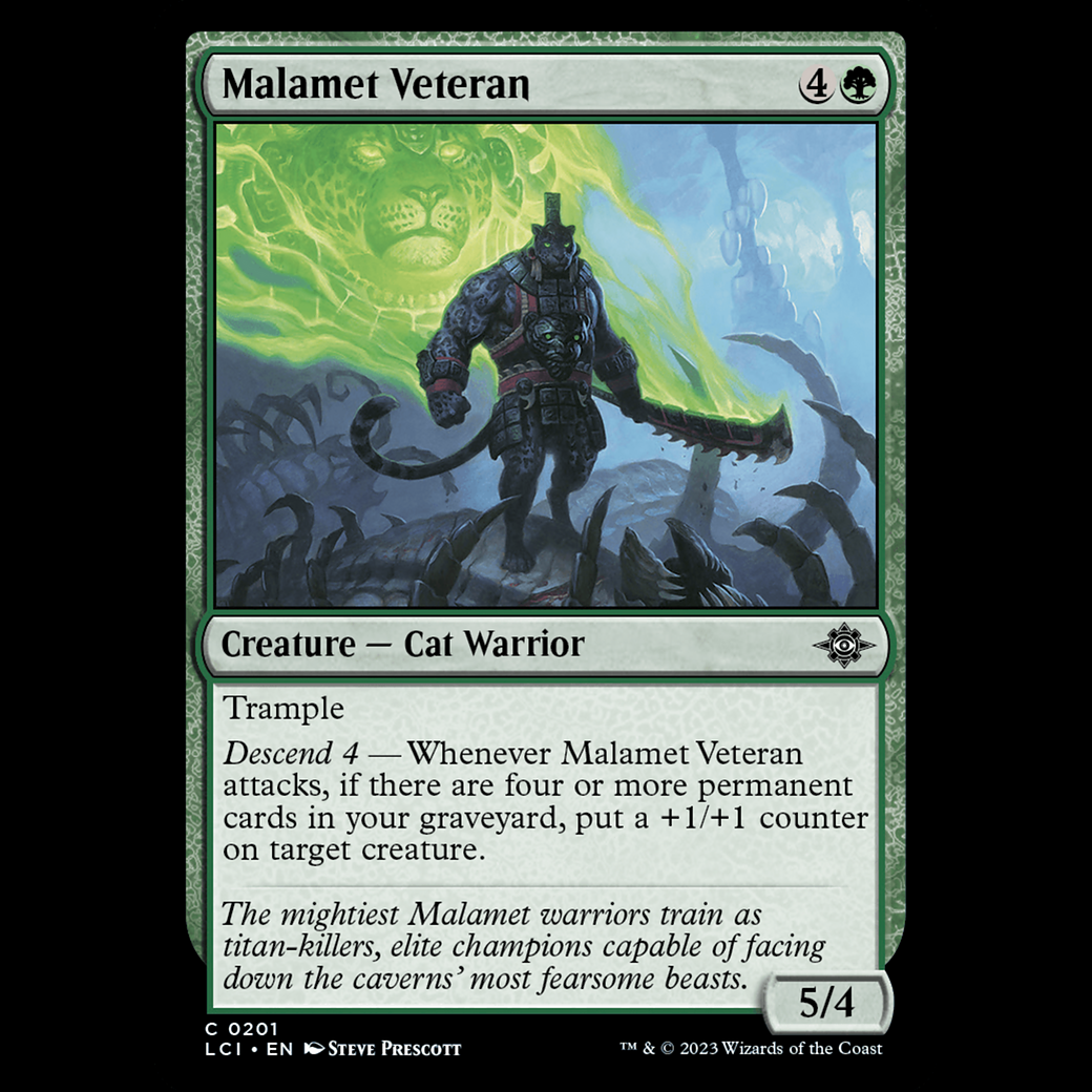 Descend 4 — Whenever Malamet Veteran attacks, if there are four or more permanent cards in your graveyard, put a +1/+1 counter on target creature.