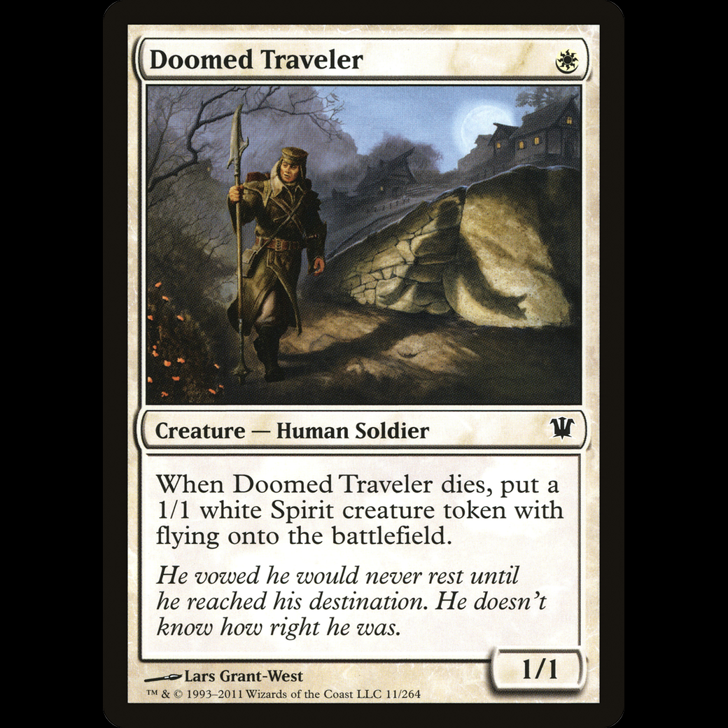 When Doomed Traveler dies, create a 1/1 white Spirit creature token with flying.