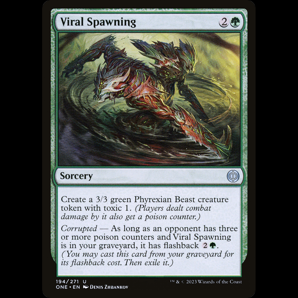 Corrupted — As long as an opponent has three or more poison counters and Viral Spawning is in your graveyard, it has flashback . (You may cast this card from your graveyard for its flashback cost. Then exile it.)