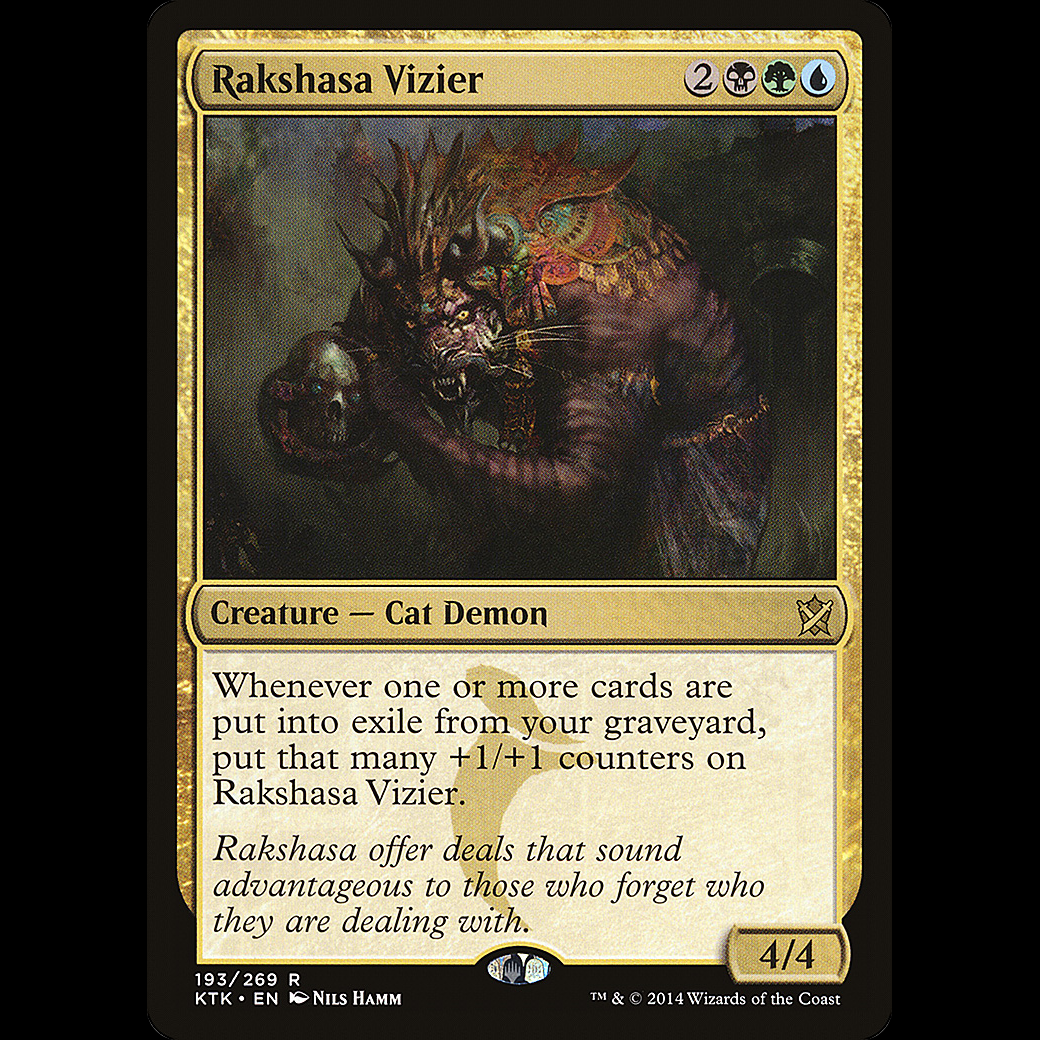 Whenever one or more cards are put into exile from your graveyard, put that many +1/+1 counters on Rakshasa Vizier.