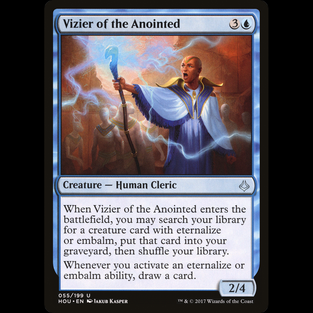 When Vizier of the Anointed enters the battlefield, you may search your library for a creature card with eternalize or embalm, put that card into your graveyard, then shuffle.